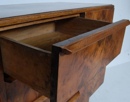 A retro vintage 1960s quarter veneered walnut sideboard having a central bank of three drawers flanked by cupboards opening to reveal a shelved interior raised on tapering legs. 80cm h x 136cm w x 48cm d