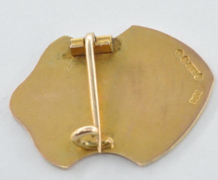 A 1920's 9ct gold Football Association international selection committee badge having a blue enamelled FA monogram to the centre. Hallmarked London 1924. Weight 6.24g. Measures 3cm high.