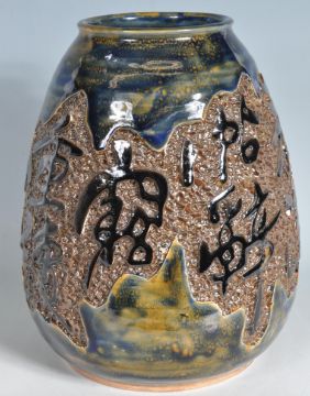 A large contemporary chinese ceramic vase of bulbous form having a chinese characters to the central panel with textured background. Makers stamp to the base. Measures 30cm. No visible damage