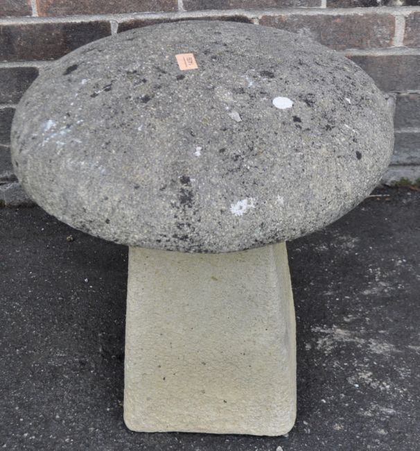 An early 20th century reclaiming composited saddle stone garden seat / mushroom garden ornament. The large ornament having a mushroom / dome top raised on a square tapered base. Measures 51 cm H x 47 cm Diameter