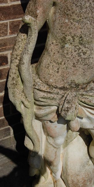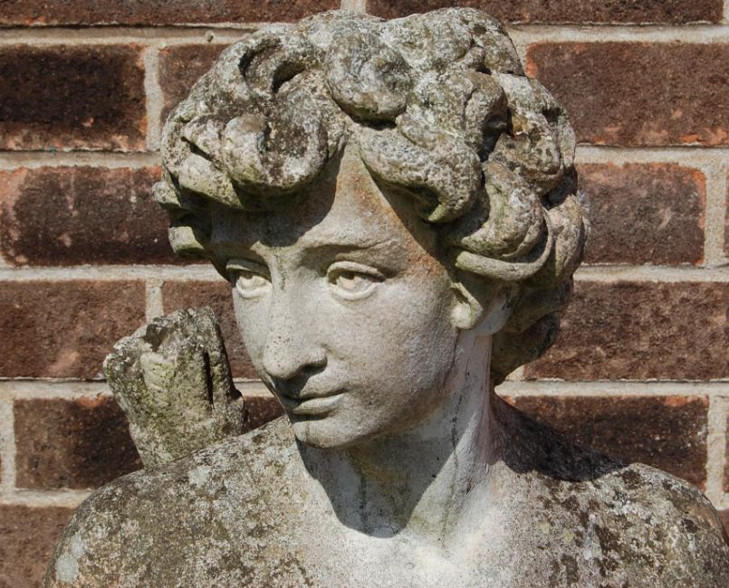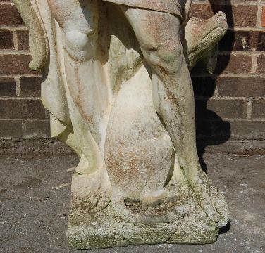 A large composite reconstituted stone garden statue figurine in the form of a classical male figure wearing a loin cloth with a quiver of arrows and a dog sat at his feet.