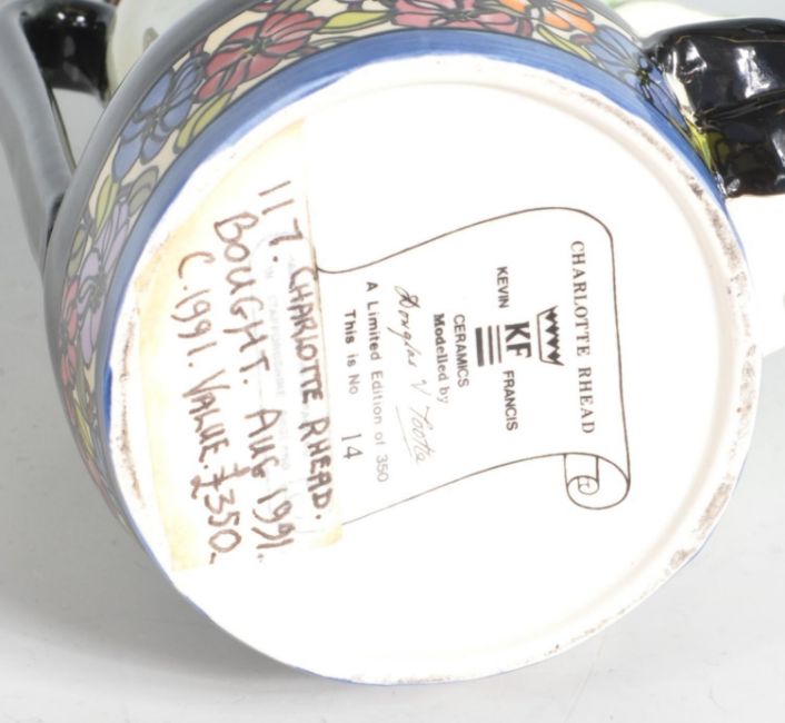 A vintage late 20th century ceramic Kevin Francis figurine of Charlotte Rhead. Limited edition No 14 of 350. Modelled by Douglas V Tootle. Measures 23cm. Makers stamp to the base. No visible damage.