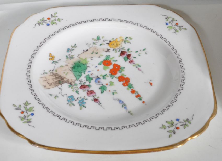 A vintage retro Tuscan china tea service all being decorated with fox glove florals with handles in the form of fruits, incudes tea pot, hot water jug, cake plates, creamer jug, sugar bowl etc. Measures approx.: 20cm tall.