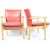 Parker Knoll - A matching set of four retro vintage 20th Century British Design beechwood lounge chairs / armchairs. Each chair having curved padded backrests with flat show wood armrests either side of red faux leather soft cushion seat rest. Each raised on straight square tapering supports. Marks to the undersides. Each chair measures approx 80cm x 62cm x 53cm.