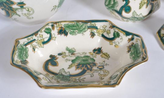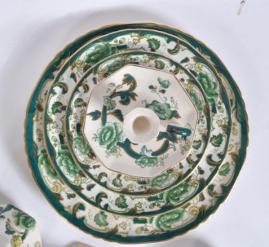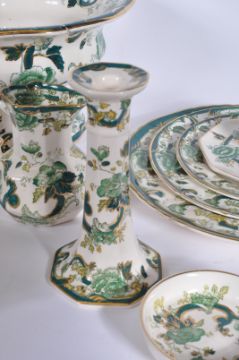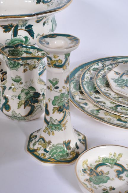A collection of early 20th century Mason’s ironstone Chantreuse pattern ceramic ware to include three graduated plates, candlestick, bell, napkin ring, jug, centrepiece tazza, ginger jars, etc. All with Mason’s stamp to the underside. The big centrepiece is broken. Measures: 15cm tall.