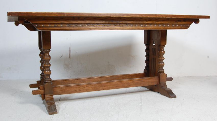 A 20th century antique style oak dining table by Old Charm. The large table of a rectangular form having carved and decorated frieze raised on splayed legs united by stretchers together with six chair ( two carvers ) makers mark to the underside. Condition: good condition, solid table and chairs. Age related marks. Measures approx.: 75cm H x 158cm W x 92cm D.