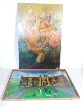 Beverly Skinner - A pair of mid century 1960s oil on board paintings by Bristol Modernist / abstract artist, Beverly Skinner. The first depicting a lovers embrace entitled Lovers by a River,  dated 1965. Together with another painting entitled Family Outing at Highbury House, St. Micheal Hill which is dated 1968. The largest measures 163cm x 122cm.