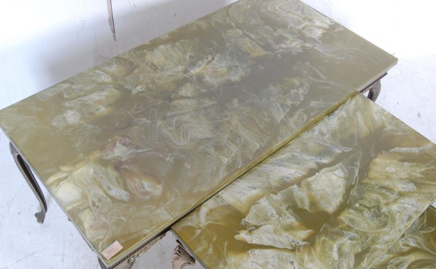 A vintage 1950s mid 20th century retro marble and gilt metal nest of tables in the rococo manner. Raised on gilt metal rococo frames with detailed frieze having green marble / alabaster veined tops. Measures approx.: 50 x 100 x 50cm.