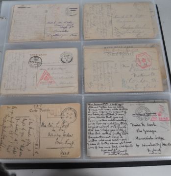 WWI MILITARY POSTAL HISTORY British Military postmark collection of The Great War. Album with 400+ postcards mostly from The Front showing Army Post Office and Field Post Office numbered postmarks both hand stamped and machine cancels. A few naval. Variety of views both topographical (with many ruined buildings), sentimental / greetings etc. Messages also of huge interest.