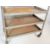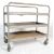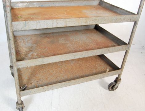 A vintage retro mid 20th century metal factory industrial trolley / kitchen trolley. The two tier trolley having curved handles on each side with gallery edges metal trays raised on casters and finished in dark gray enamel paint.
