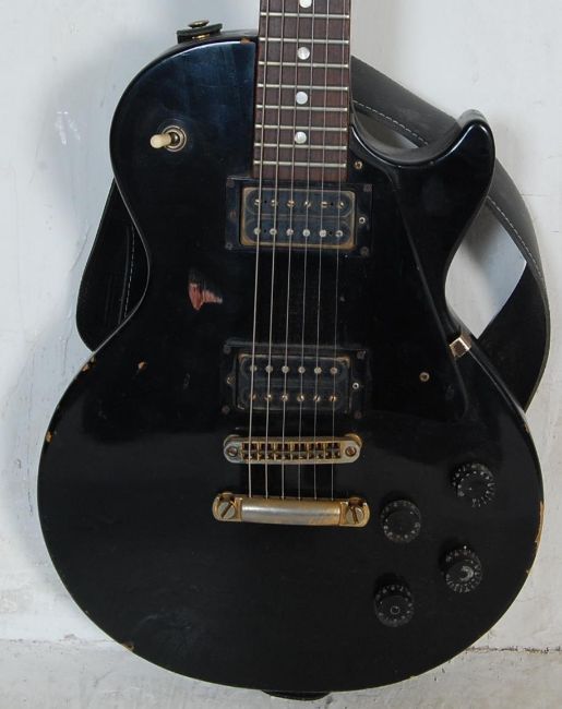 A retro vintage Ibanez Deluxe 59'er electric guitar musical instrument having , black lacquer with hardwood finger board, with 22 metal frets mother of pearl disc inlay, plated to back inscribed G770616. Made in Japan.