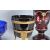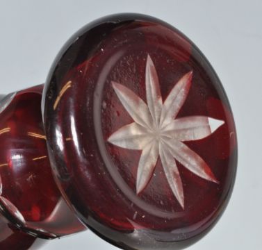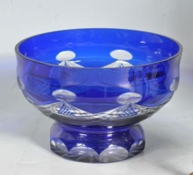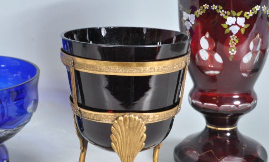 A collection of three 20th century flash cut glass items to include a hand painted gilt ruby glass vase, a ruby glass dish within a brass holder and a blue flash cut glass art deco bowl with stepped base. Measures 19cm tall.
