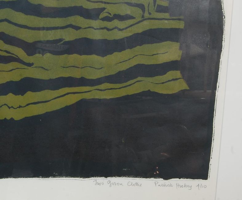 Patrick Hickey (1927-1998) A 20th century abstract screen print by Irish artist Patrick Hickey entitled Two Green Clothes. Signed to the left hand corner. Framed and Glazed. Measures 73cm x 93cm.