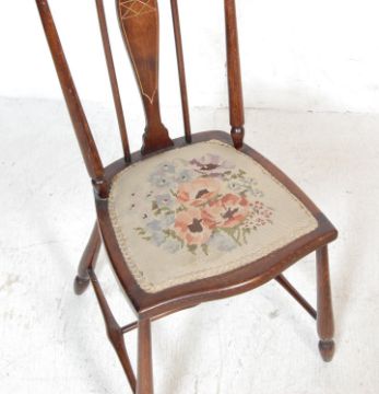 An early 20th century Arts and Crafts Edwardian mahogany having a shaped top rail with an inlaid splat over an embroidered tapestry seat raised on turned legs united by an H stretcher. Measures 85 cm H x 37 cm W x 37 cm D