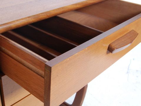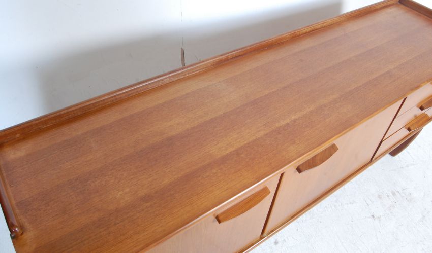 A retro vintage 1960s mid 20th century teak wood sideboard having a gallery back with a bank of three drawers to the right and a twin door cupboard to the left opening to reveal a shelved interior raised on quadrille style legs.Measures, 73 cm H x 183 cm W x 47 cm D
