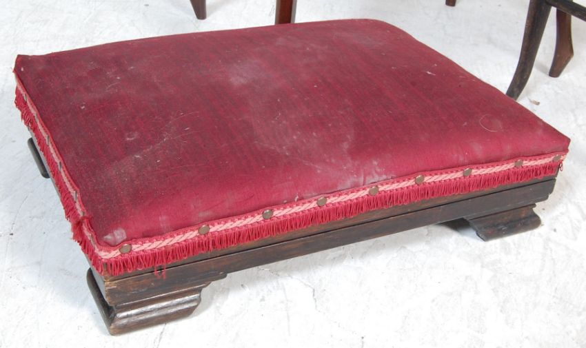 A group of mid 20th century antique style furniture to include a magazine side table / lamp table with scrolled edge top, 1950's triptych dressing table mirror, oak stool and Victorian gout stool. Measures 69 cm H x 60 cm W x 43 cm D