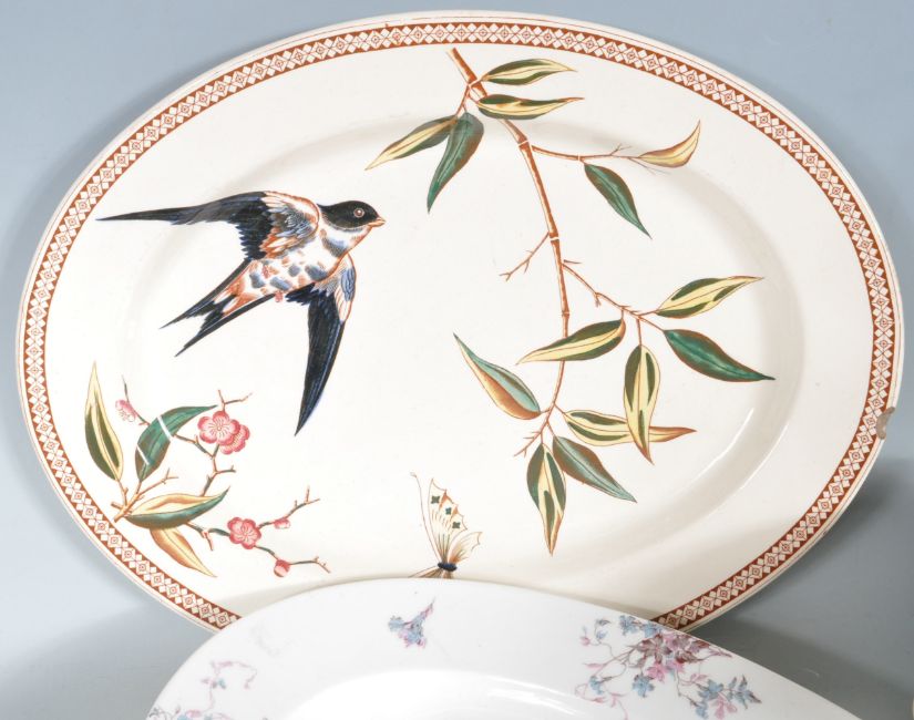 A collection of vintage 20th century ceramics comprising of a Wileman swallow platter, Limoges drainer together with twelve Kirkland Fan pattern soup plates. Makers stamp to the base. Measures 52cm.