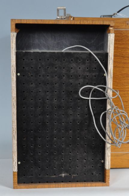 A retro vintage 1960s mid 20th century Elizabethan 40 T portable vinyl record player having a Garrard Model 2026 record deck with detachable speakers. Carry handle to the top. Measures 40cm x 55cm x 25cm.