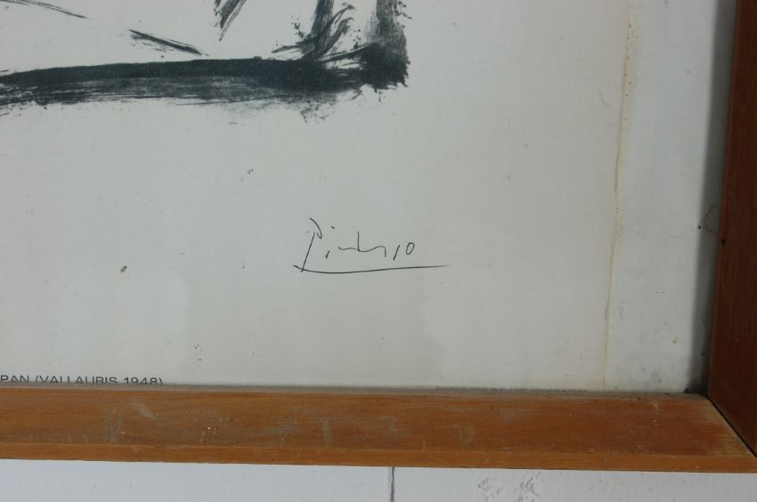 A vintage retro 20th century Pablo Picasso framed print “ pan “ vallauris 1948 printed in Denmark by J. CHR. Sorensen & Co A/S. Marked to the corner Minerva Reproduktioner, Copenhagen & S.P.A.D.E.M., Paris 1966. Framed and glazed. Measures,