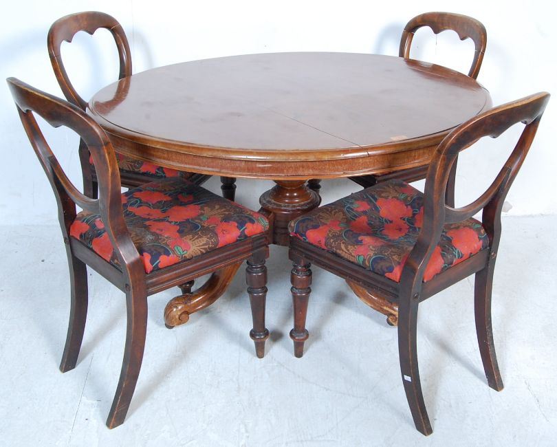 A Victorian 19th century mahogany tilt top breakfast / loo table. Raised on splayed tripod base with turned column having circular table top set above. Together with a set of 4 Victorian mahogany balloon back dining chairs being raised on turned legs Measures, 70 cm H x 117 cm W Diameter