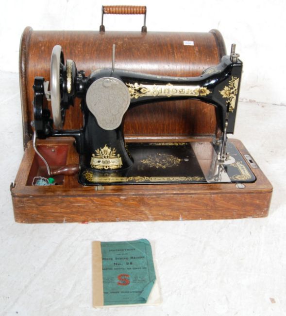 A retro vintage 1960s sewing box having a hinged lid upholstered in black leatherette opening to reveal a fully appointed interior raised on circular tapering legs. Together with a vintage 20th century Singer sewing machine. Comes with oak carry case.