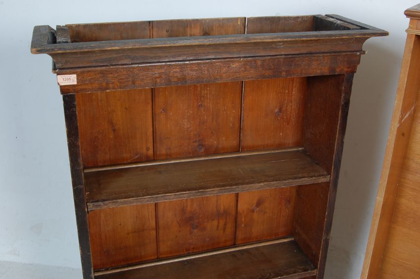 Two antique early 20th century and later bookcases comprising of an oak bookcase having a flared top over three shelves raised on a flared base together with another bookcase having a flared pediment top over three shelves raised on bracket feet.