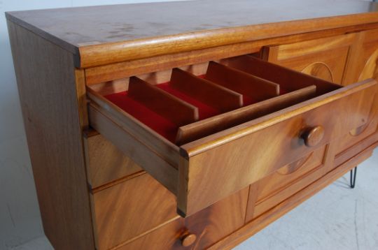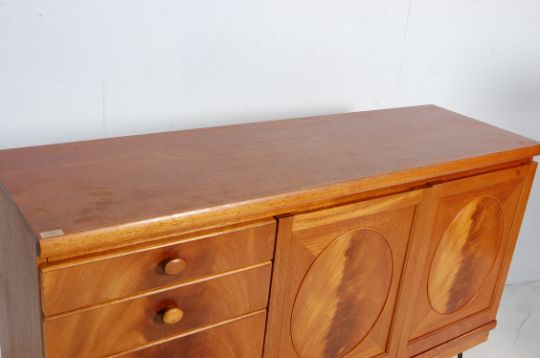 A vintage retro 20th century Nathan Furniture teak wood and walnut ' circles ' sideboard being  fitted with two door cupboard to the right, three drawers to left raised on hairpin legs. Measures, 96 cm H x 153 cm W x 47 cm D