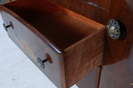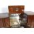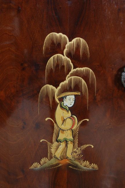 An early 20th century circa 1930’s Art Deco walnut drink / cocktail sideboard. The sideboard having to the centre a drop front drinks / cocktail cupboard fitted with mirrors and cocktail accessories above a bank of two drawers flanked by two cupboards with original cast metal handles in flower head shape. The cabinet  being fine painted / decorated with Japanese oriental scenes and motifs. Raised on casters.Measures, 100 cm H x 138 cm W x 48 cm D
