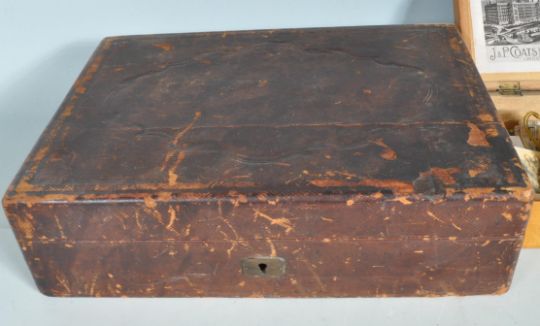 An early 20th century brown leather jewellery box of a rectangular form with hinged lid and compartmented interior along with a similar jewellery box of small proportion with fitted interior and another painted sewing box.