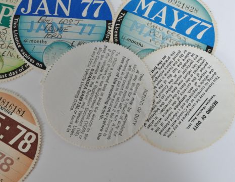 A collection of vintage retro 60’s, 70’s and 80’s Road Tax disks to include Mar, Jul, Dec 1969, Apr, Aug 1970, Sep 1971, Jan 1972, Sep 1975, Jan, May, Sep 1977, Jan, Mar, Oct 1978, Feb, Jun Nov 1979, Mar, May, Jul, Nov 1980, Mar 1981.