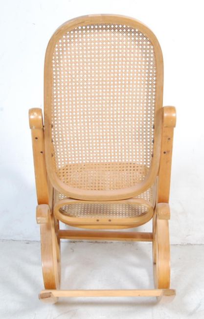 A vintage 20th Century bentwood and cane rocking chair / armchair / rocker in the manner of Michael Thonet having scrolled and looped sides, woven cane seat and backrest united by stretchers.Measures, 105 cm H x 53 cm W x 96 cm D