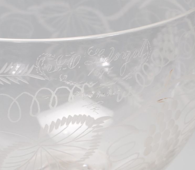 A 19th century Victorian large etched glass oversized rummer / goblet table centrepiece. Acid etched with grape and vine bearing notation for 1871. Set on a knop stem with circular base. Measures 22cm tall.
