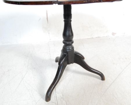 An antique Victorian tilt top centre table of circular form raised on a single column support raised on tripod legs. Table has a later top. Measures approx.: 72cm H x 81cm diameter.