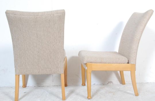 A pair of vintage Parker Knoll chairs having a beige upholstery to the seat and backrest raised on turned beech wood legs. Measures 77 cm x 48 cm W x 46 cm D