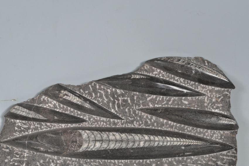 Natural History - A pair of polished fossil specimen of orthoceras being preserved in limestone, Devonian period. measures: 44cm longest.