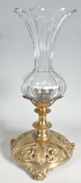 An antique early 20th century gilt bronze centrepiece / vase having an ornate brass base decorated with pierced foliate forms of acanthus leaves supporting a scalloped cut glass vase of fluted form. Measures 46cm tall.