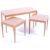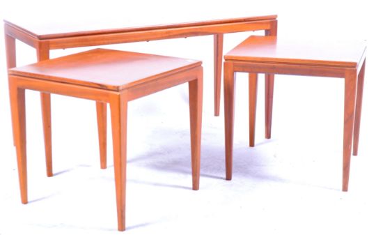 A retro vintage mid 20th Century teak wood nesting tables / nest of tables consisting of one long table over two smaller with each being raised on shaped angular tapering supports. Biggest measures approx 45cm x 84cm x 38cm.