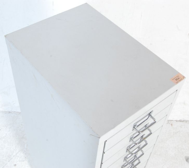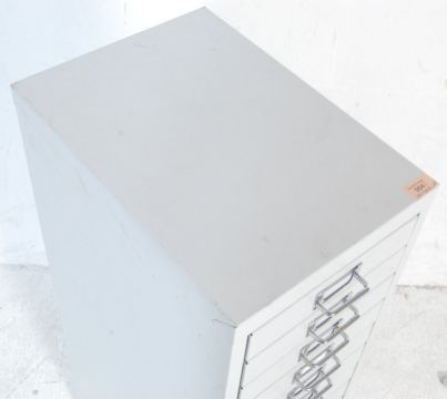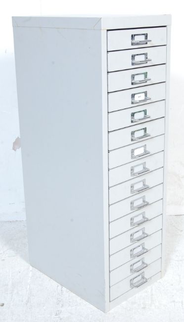 A retro vintage industrial Bisley style filing cabinet having a bank of fifteen drawers having chrome handles with name plate. Painted in a grey colourway