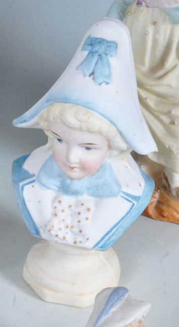A collection of 20th century Continental polychrome bisque figurines comprising of a girl holding a doll, a boy with an urn, a boy in an oversized hat, a bust and more. Measures approx.: 27cm tall.