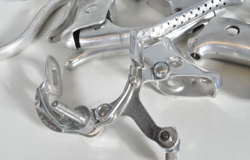 A collection of retro vintage 20th century Weinmann bicycle related parts / spares comprising of brake calipers, brake pads / shoes, brake levers, hoods, springs, steel cables and more. Excellent and rare collection.