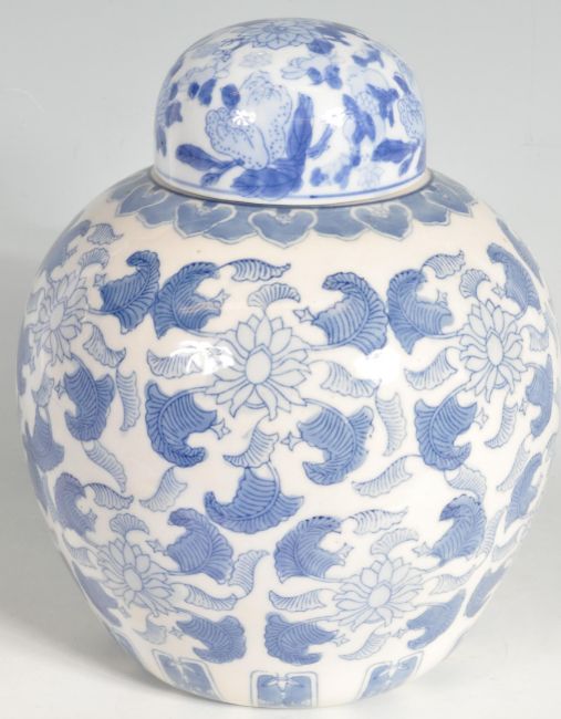A large Chinese 20th century ceramic blue and white lidded ginger jar of ovoid form having floral decoration throughout. Small signs of wear and tear commensurate with its age. Measures 27cm high.