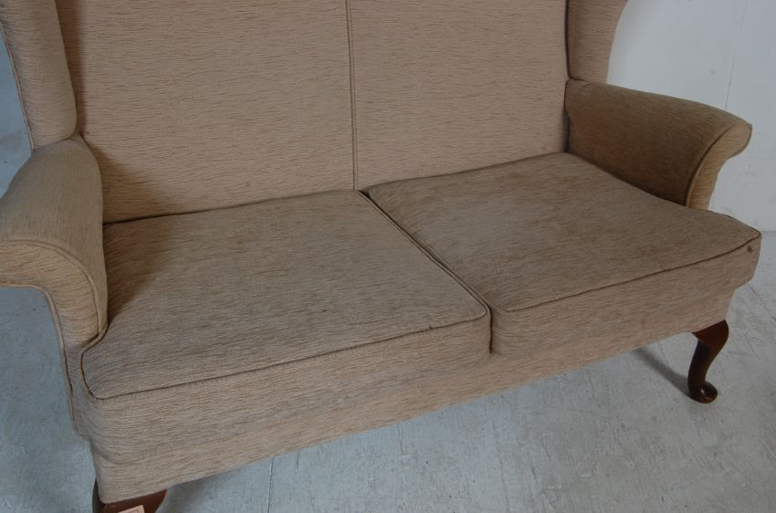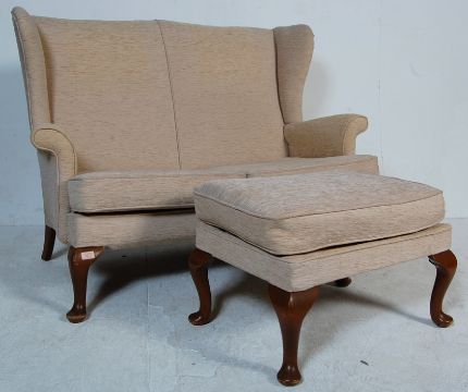 A vintage retro late 20th century Parker Knoll wingback sofa settee. The two seater sofa being upholstered in cream fabric with detachable cushion raised on Queen Anne / cabriole legs along with a matching stool. Measures, 93 cm H x 115 cm W x 60 cm D