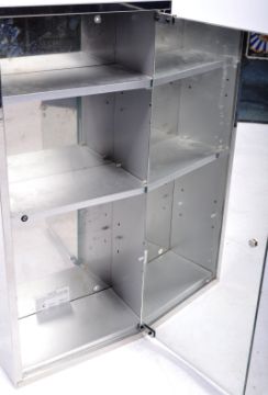 A vintage late 20th Century upright wall hanging / free standing medicine bathroom cabinet of polished metal construction. Full length mirrored door opening to reveal an adjustable shelved interior  with mirrored back panel. Measures approx 65cm x 30cm x 14cm.