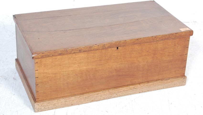 A late 19th century Victorian miniature oak coffer. The coffer of a rectangular form having hinged lid, candles box to the inside raised on a plinth bale. Measure: 25cm tall x 63cm wide x 32cm deep.