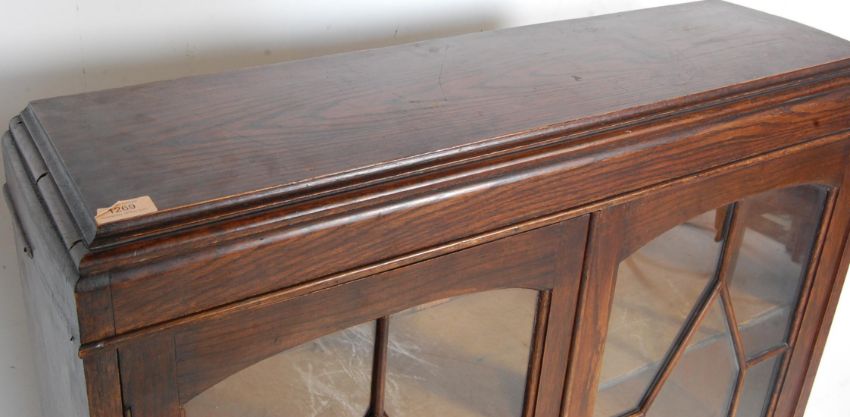 An early 20th century 1920s oak bookcase cabinet vitrine having astragal glazed doors raised on turned legs united by stretchers. Measures approx.: 119cm H x 87cm W x 25cm D.