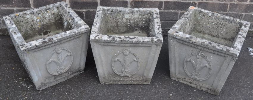 A collection of three vintage 20th century reclaiming composite garden pots of a large square form with tapered body and raised decoration. Measures, 32 cm H x 36 cm W x 36 cm D