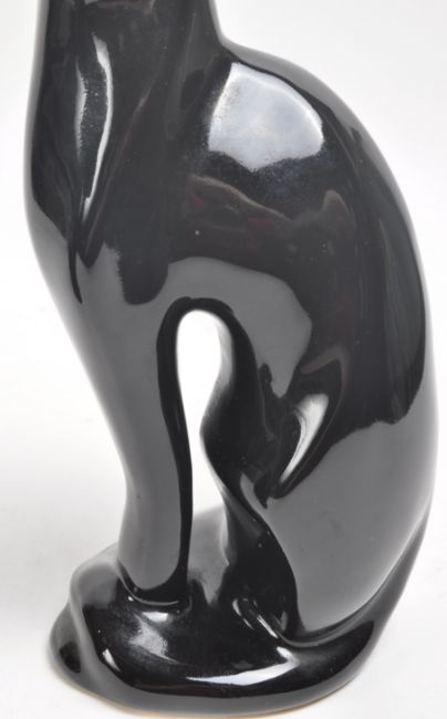 A pair of vintage retro mid 20th Century ceramic black cats each of elongated stylised form having green painted luminous eyes. Each with felted bases. Measures 29cm.