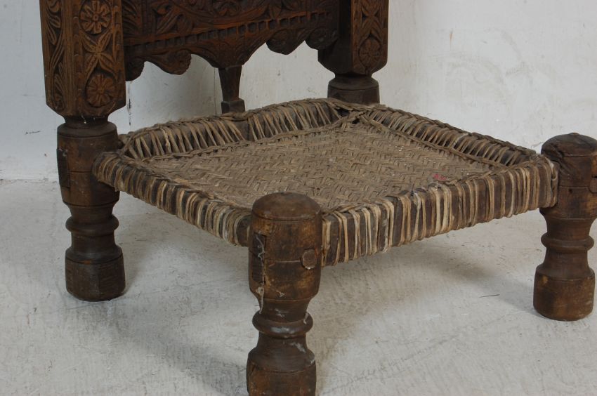 An early 20th Indian low carved hardwood chair having finial tops with a profusely carved backrest with foliate detailing over a rush seat raised on circular supports.