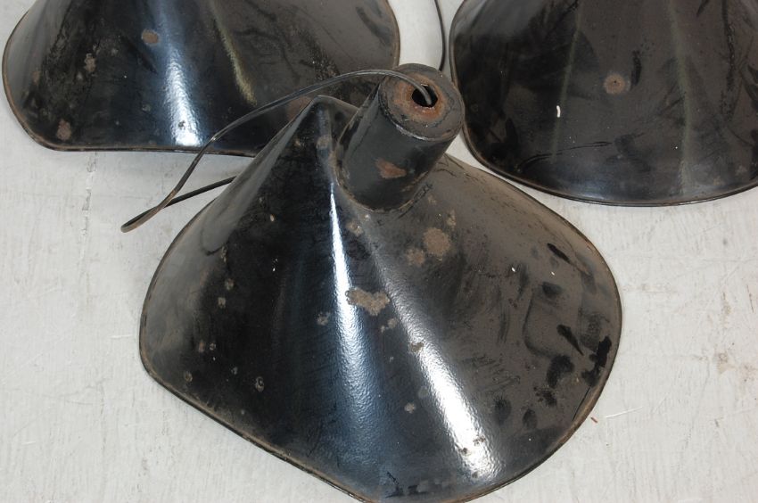 A pair of retro vintage industrial factory lights having shaped metal conical shades raised on a long metal tubular frame.
