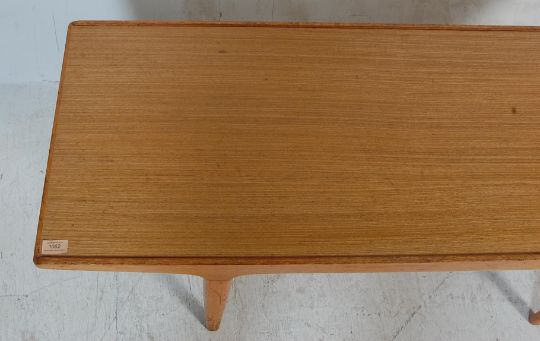 A vintage retro 1970’s teak wood coffee table. The coffee table of a rectangular form with raised edges and tapered legs united by a rail magazine rack. Measures, 41 cm H x 124 cm W x 48 cm D